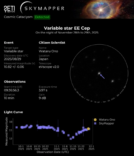 On November 28th, 2025, the network successfully detected the variable star EE Cep during a cosmic cataclysm event.